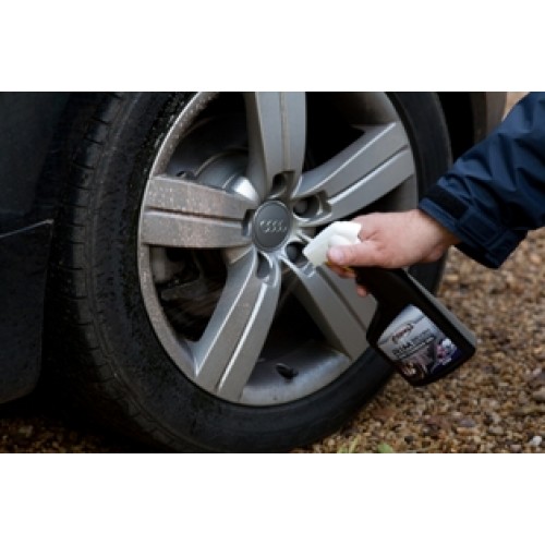 Before use, shake RIM 7 vigorously! Spray the dry wheels until completely covered. Let RIM 7 do its work for five minutes and then rinse off thoroughly with a powerful hose or pressure cleaner. When dealing with extremely encrusted wheels, we recommend you use the Scholl Concepts Purple Spider Hand Cleaning Puck.
