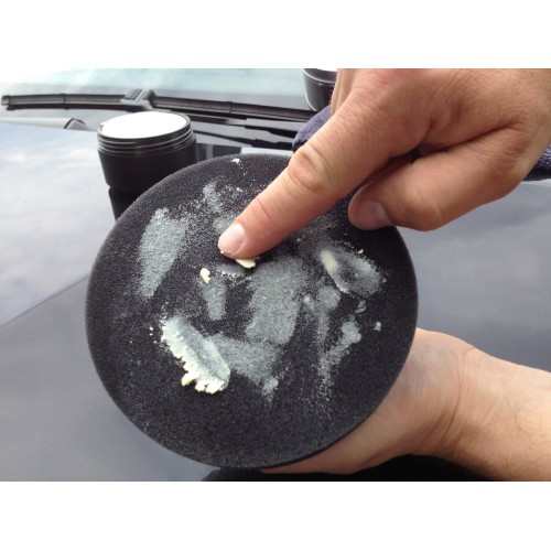 Smear a small amount (about the size of a hazelnut) of wax evenly on to the Scholl Concepts Black Wax/Dressing Hand Puck. With even force, apply the wax on the paint surface in partially overlapping circular motions. A few seconds later, a film of dried wax residue will appear.
